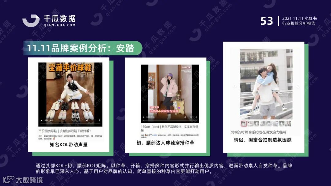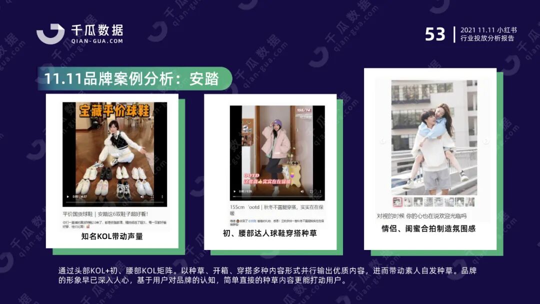 对于品牌在小红书的不同阶段进行不同的投放策略,更能够精准触达到用户。安踏品牌的形象早已深入人心,品牌在投放中不会过多的对产品的性能、外观做赘述,而是更多展示产品的“好搭配”、“颜值高”等卖点,简单直白的种草。
