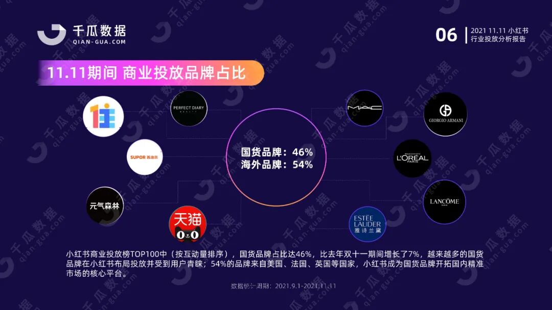 在今年的商业投放品牌榜TOP100中(按互动量排序),国货品牌占比46%,比去年双十一期间增长7%。可见越来越多国货品牌会选择小红书平台做为打造声量市场的阵地,能快速地与用户直连,从心智的种草甚至到一次触达用户,在站内就能完成种草到拔草的链路。