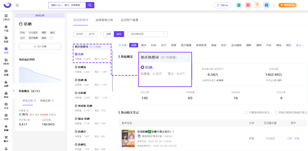 据果集·千瓜数据实时统计,“防晒”3月份在小红书笔记中共有9477篇相关热文,热度值为17.02万。“防晒日常化”深入消费者心理,品牌方也紧紧抓住了迭代的防晒需求,针对性的推出新款功效型防晒产品,解决了消费者的防晒顾虑,在功效型细分防晒市场中获得更多增长潜力。