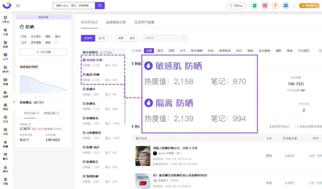 果集·千瓜数据搜索2022年3月份“敏感肌防晒”笔记有956篇、“防晒隔离”笔记有1119篇、“物理防晒”笔记有741篇,多效合一的防晒产品更受消费者青睐。