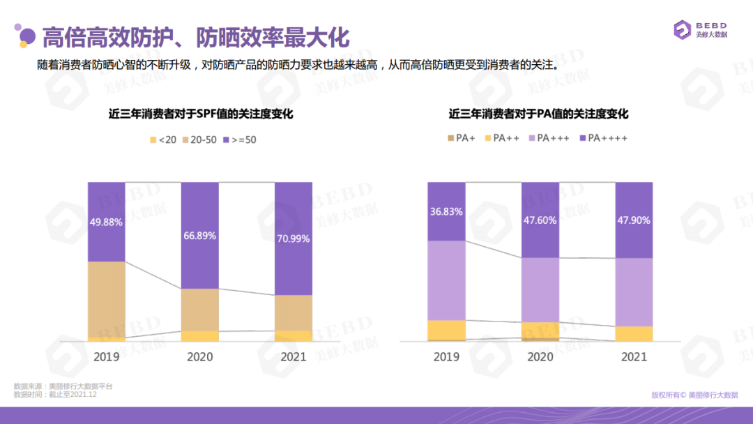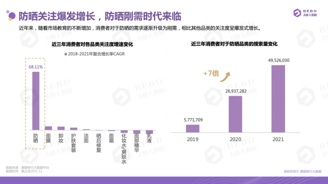 据美丽修行大数据团队重磅发布了《2022年防晒行业趋势指南》,2018年-2021年,消费者对防晒的需求逐渐升级为刚需,对比其他品类关注度成爆发式增长,防晒搜索量2019年-2021年增长7倍。