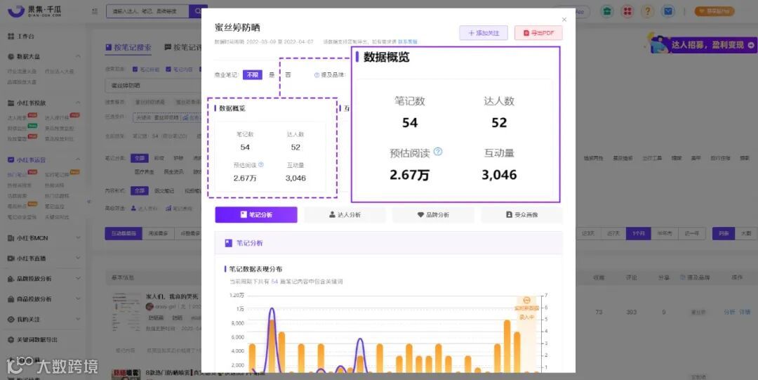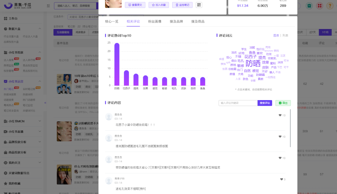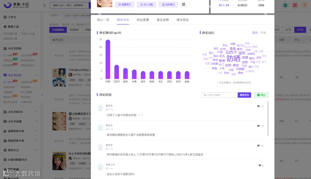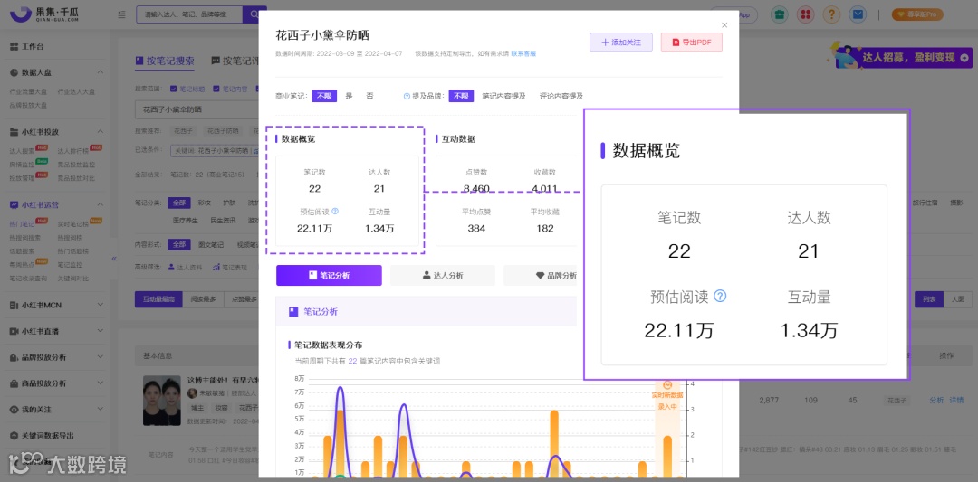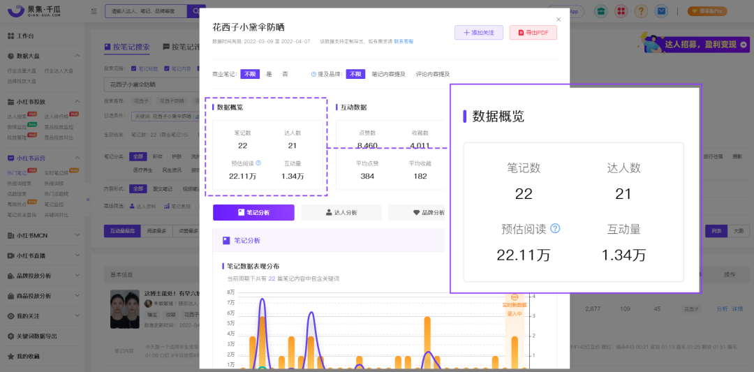 据果集·千瓜数据-热门笔记显示,“花西子小黛伞防晒”相关笔记超过200篇,近30天(2022.3.7-4.6)种草笔记数20篇,其中商业笔记就有15篇,互动量超过1.34万,在3月份的防晒赛道中铺开了产品声量。