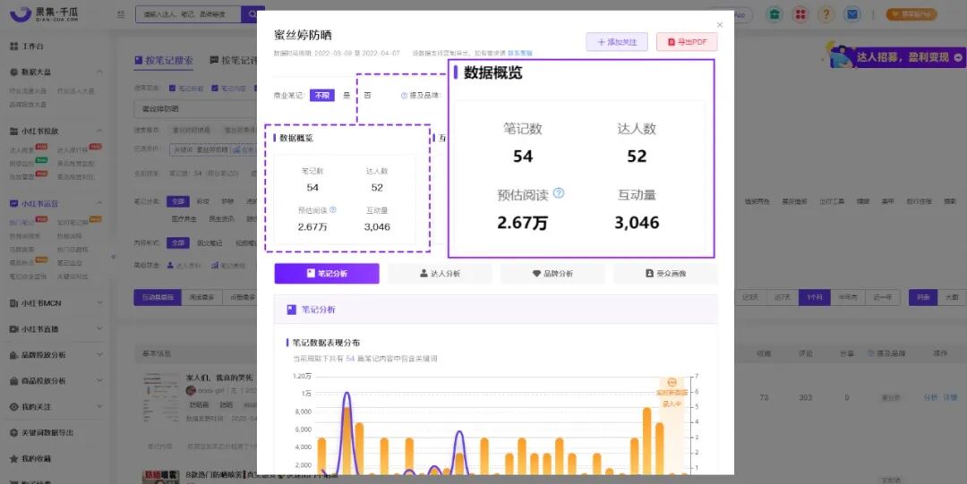 据果集·千瓜数据显示,“蜜丝婷防晒”相关笔记超过3500篇,近30天(2022.3.7-4.6)种草笔记数56篇,互动量超过3061。