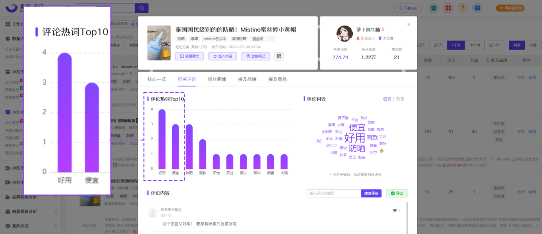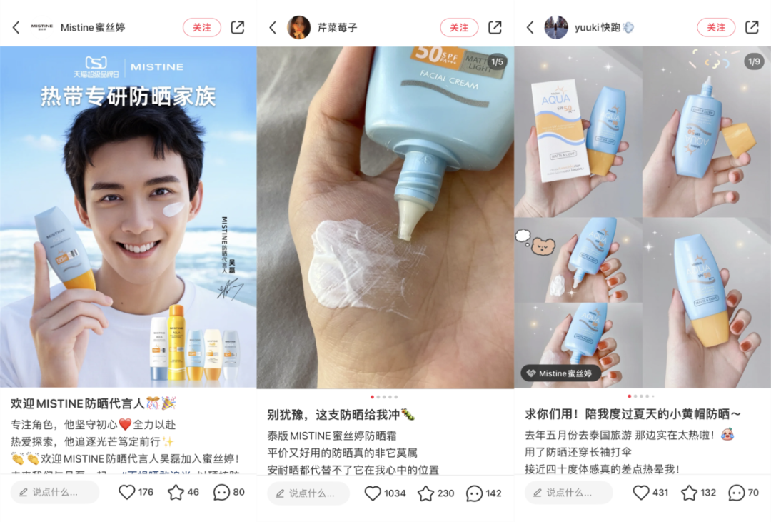 “蜜丝婷防晒”相关笔记中,“好用”、“平价”、“亲民”等关键词出现在前列,用户被这些因素成功打动,性价比高让蜜丝婷在一众防晒产品中成功出圈,在2021年天猫618期间,Mistine小黄帽防晒霜累积销售近40万,位于防晒霜销售榜NO.1。