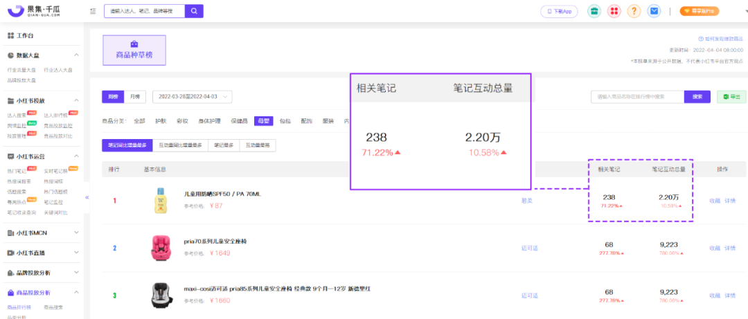 此外,防晒产品已经深耕更多细分领域,入局母婴人群,深受消费者喜爱。在小红书上搜索“婴儿防晒”有20万+篇笔记,果集·千瓜数据商品种草榜显示,小红书婴儿防晒排名第一的“碧柔儿童防晒乳”3月笔记数量为572篇,笔记互动总量为6.69万,种草更多消费人群。