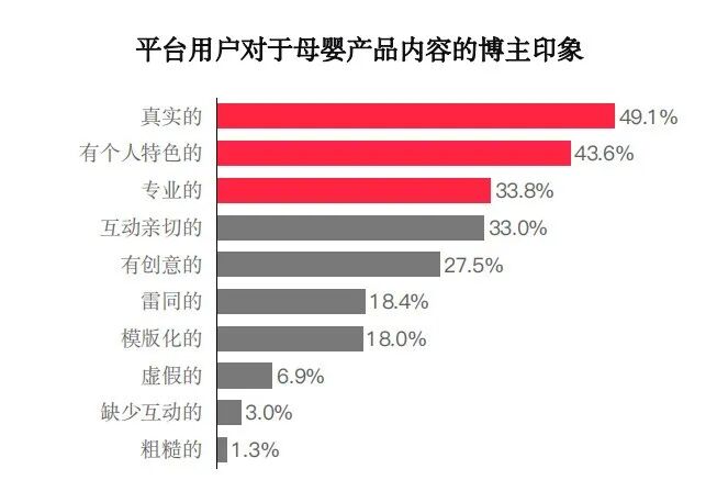 小红书母婴博主所分享的内容和信息对于引导母婴人群决策具有相当大的影响力,用户更加青睐真实(49.1%)、有个人特色(43.6%)并且有专业背书(33.8%)的博主。