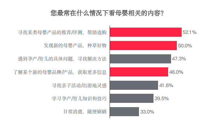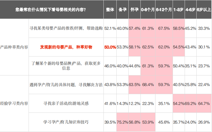 母婴行业具有很强的消费前置性,边学习边种草成了母婴消费新趋势。调研显示,50%备孕用户已经带着“发现新的母婴产品,种草好物”的目的浏览站内母婴内容。