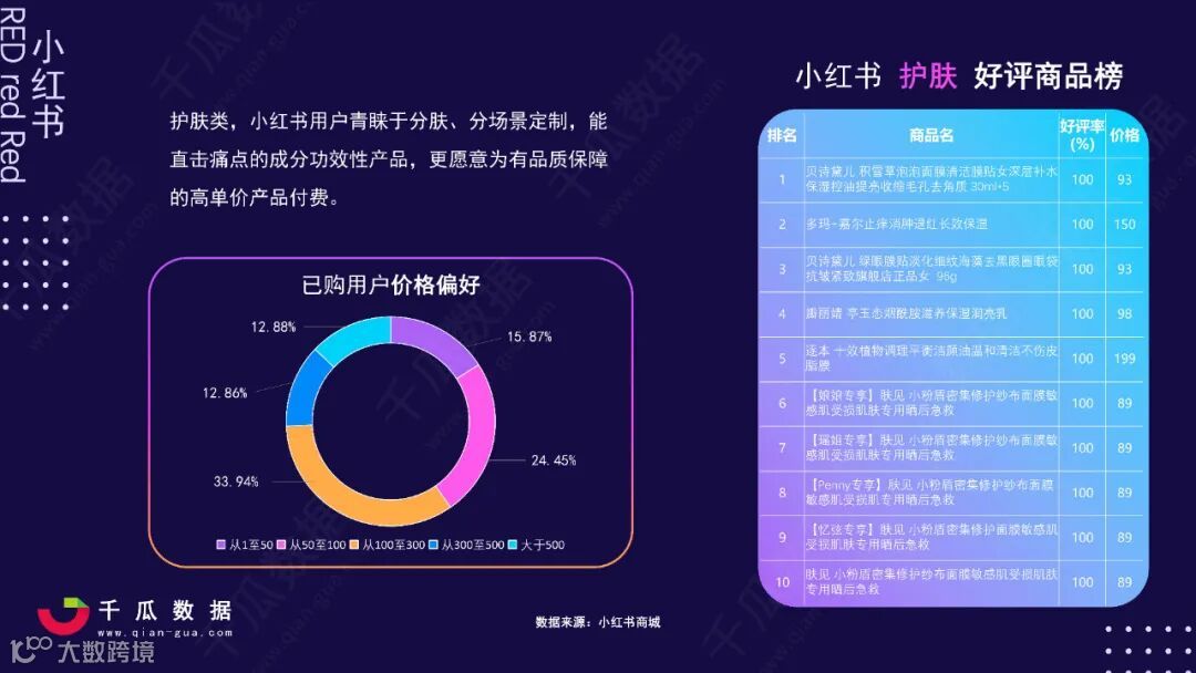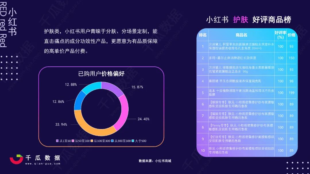 根据2021小红书活跃用户画像报告可知,小红书用户以年轻女性为主,消费能力强劲,对护肤用品的高单价偏好超其它行业,所以多利用腰初部达人的强粉丝粘性和消费引导力能更快的占领用户心智,获得转化。