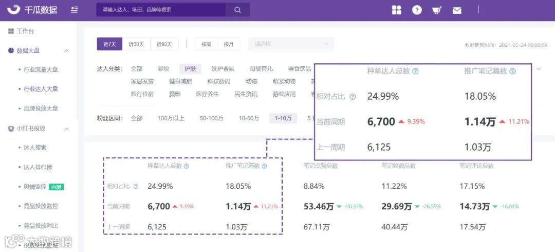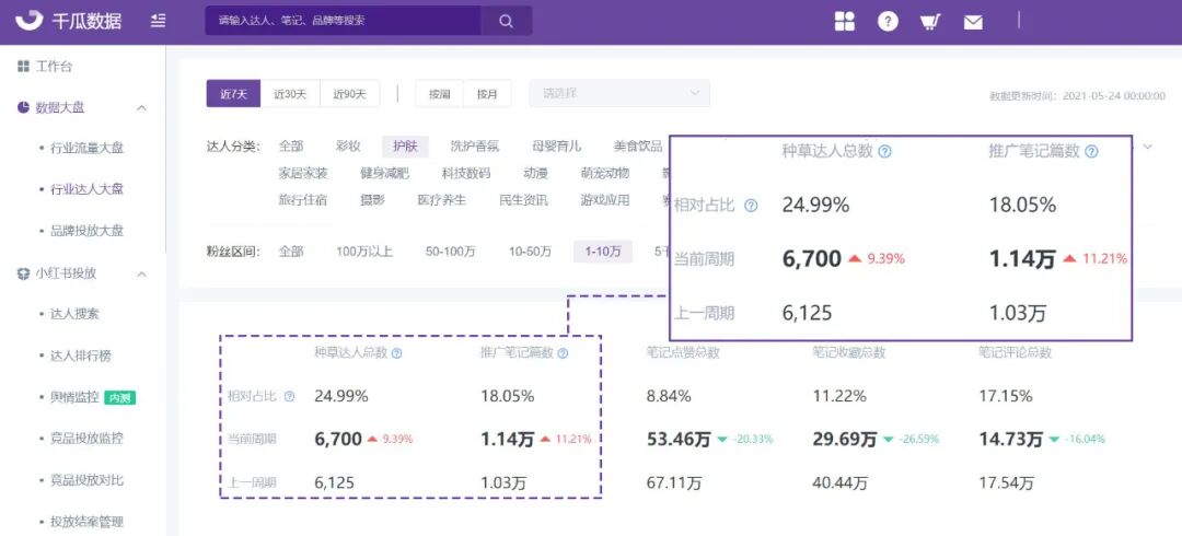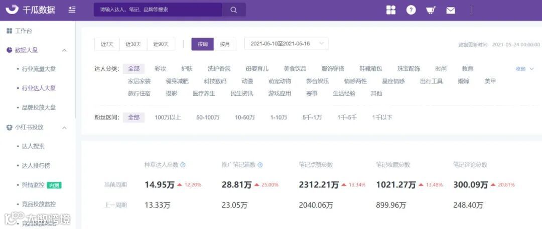 千瓜数据全新上线小红书行业达人大盘,为用户提供市场宏观监测,了解小红书近期时间范围内各行业达人种草数据和趋势,更好的助力品牌发展。