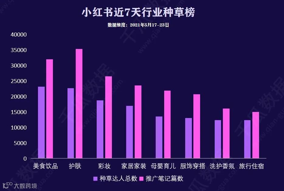 分类查看近7天小红书各行业种草数据可见,美食饮品类目的种草达人总数超其他行业,成为小红书种草达人最多的类目,而护肤则是小红书推广笔记篇数最多的行业品类。此外,彩妆、家居家装、母婴育儿等行业数据突出纷纷上榜,进一步彰显了小红书多元化发展的趋势。