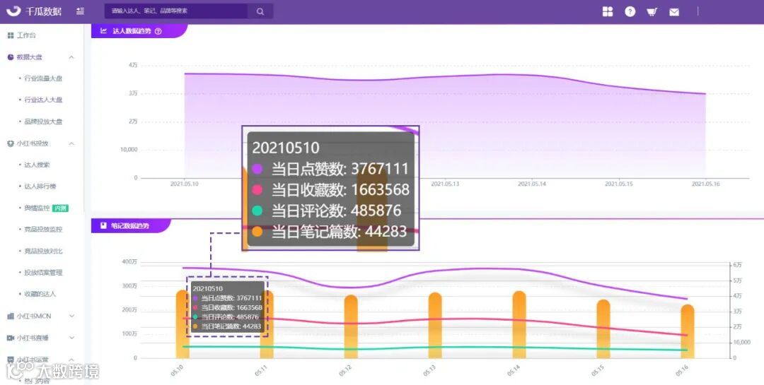 通过达人数据趋势和笔记数据趋势折线图,可以看到具体到某一天的达人、笔记数据,详细了解小红书达人种草数据的具体趋势变化,如5月10日这天的笔记数据为这一周小红书种草笔记篇数最多、赞藏评数据最高。