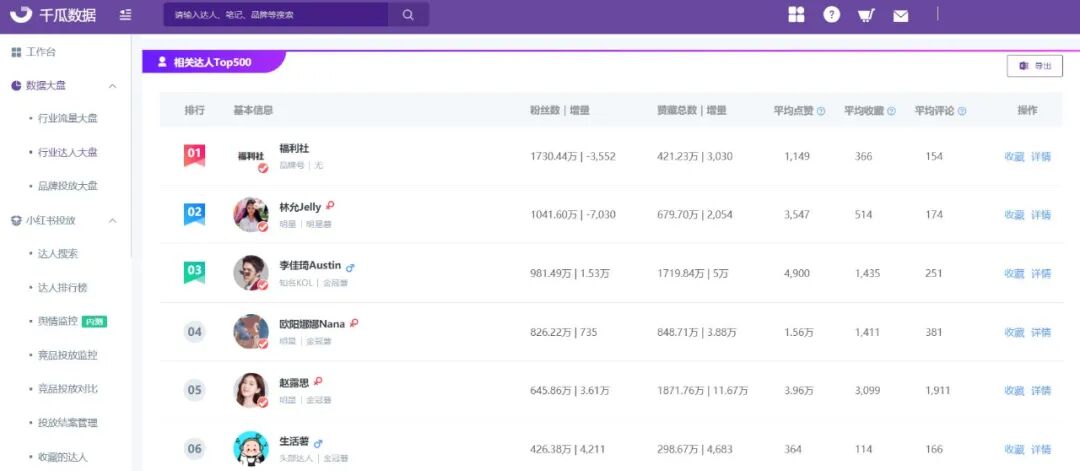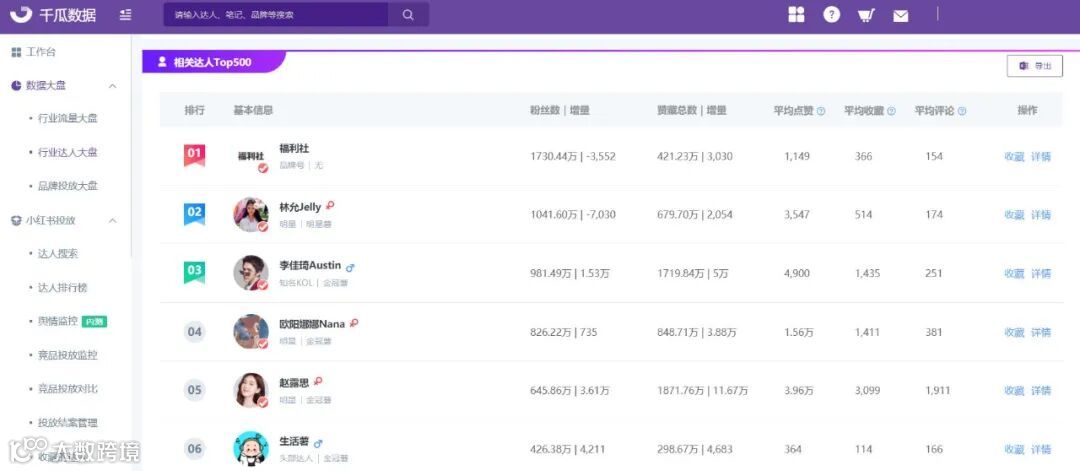 此外,行业达人大盘提供查看相关达人TOP500,方便用户快速对标具体达人,了解其在行业大盘中的影响力,为后续品牌达人投放做参考。