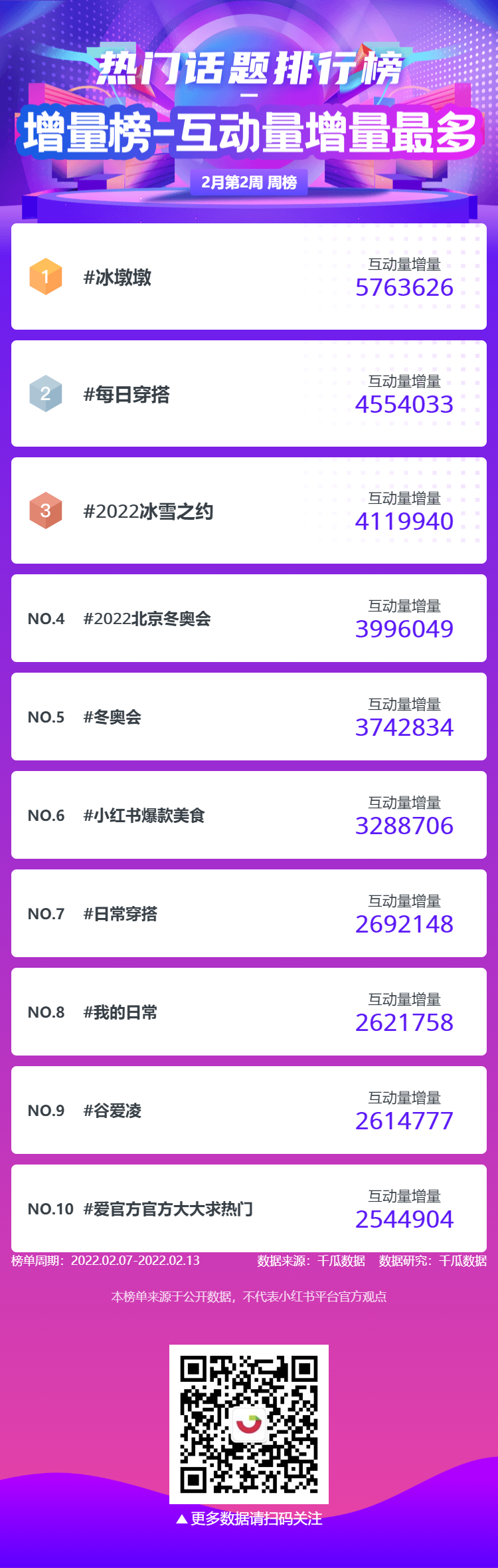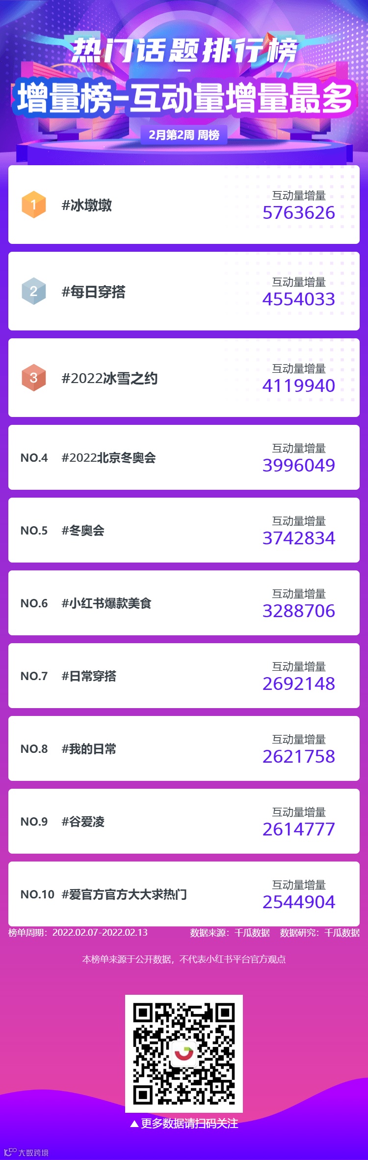 热门话题排行榜-增量榜-笔记增量最多中“冰墩墩”排名第一,互动量增量5763626;“每日穿搭”排名第二,互动量增量4554033;“2022冰雪之约”排名第三,互动量增量4119940。