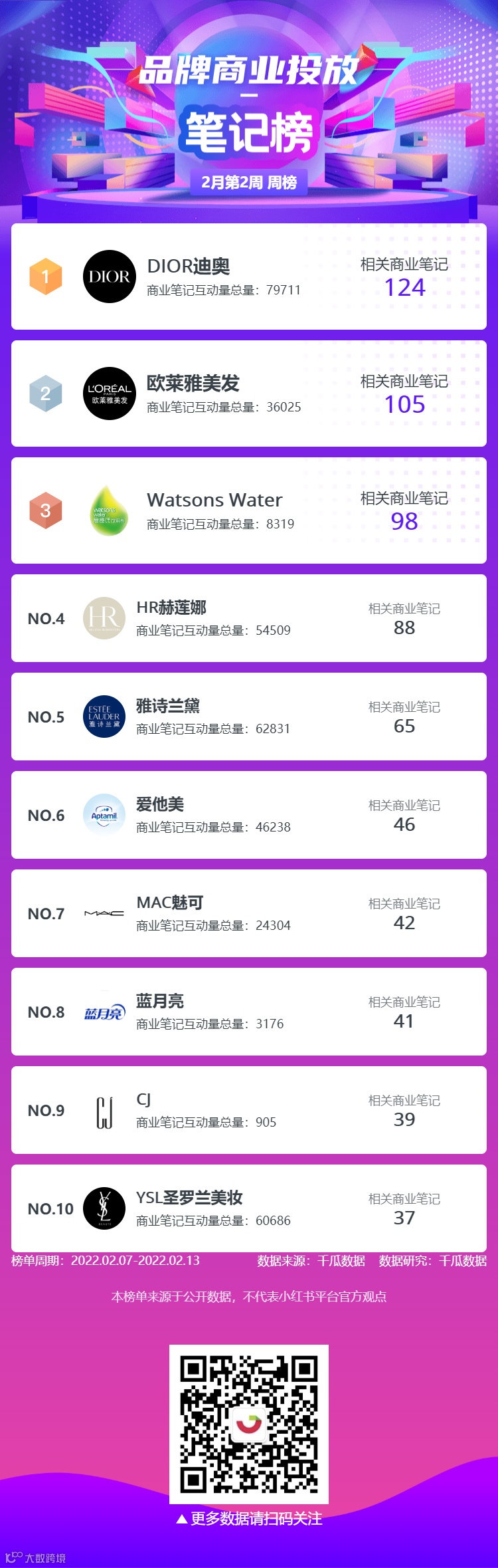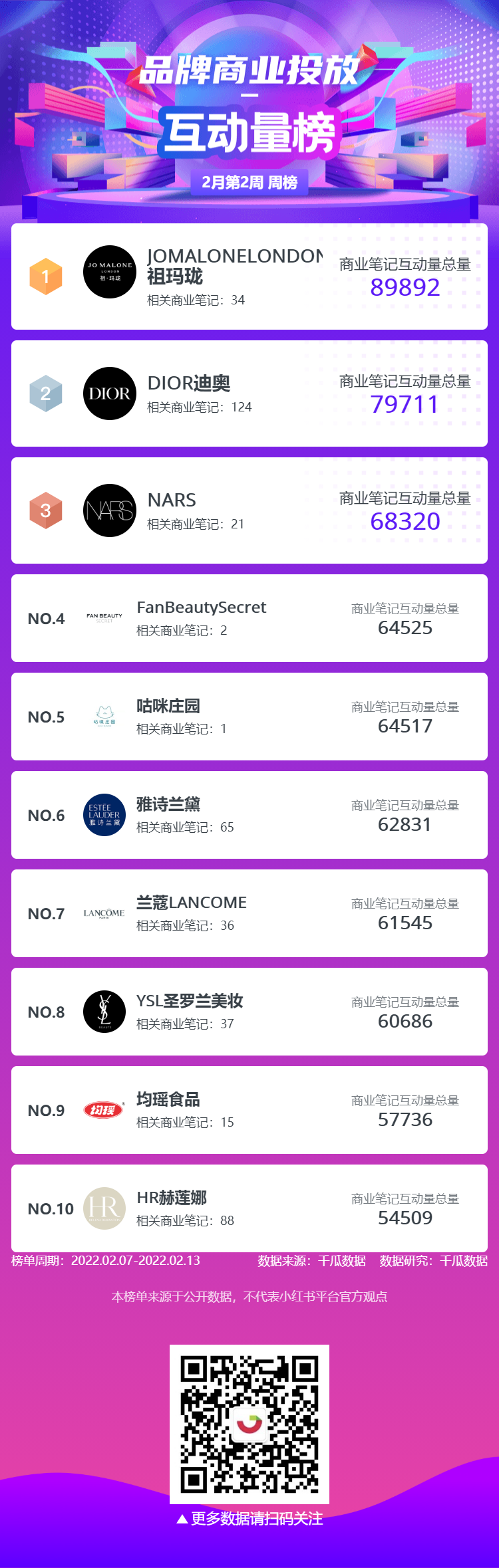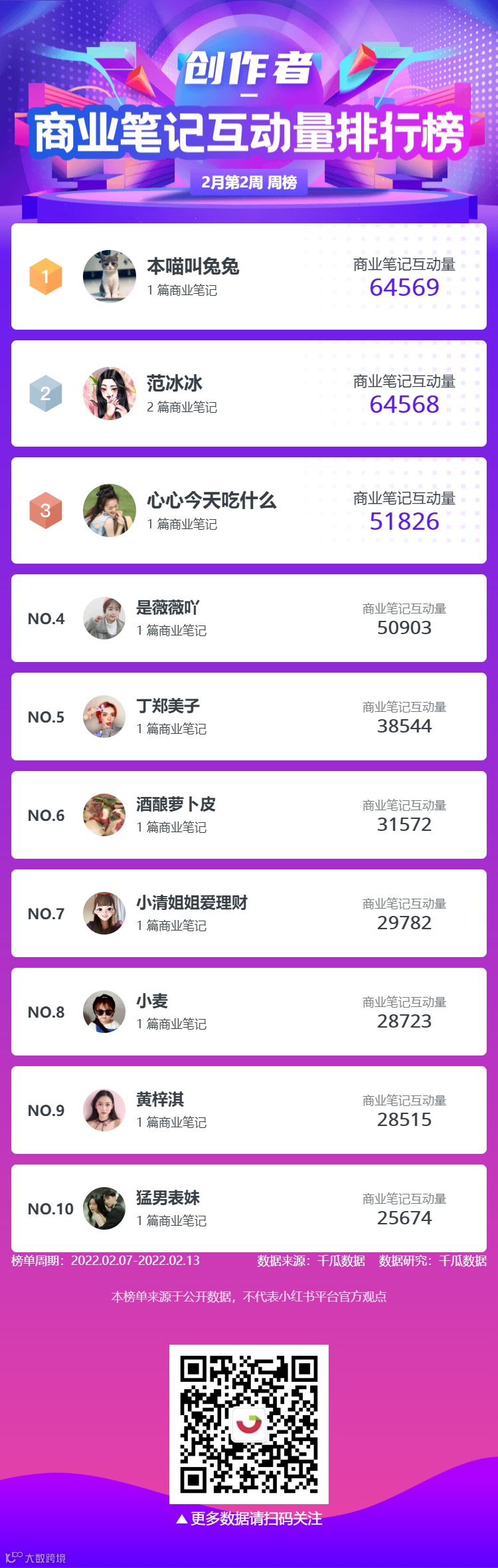 千瓜为大家整理了2月第2周六大榜单周榜(小红书平台),千瓜涨粉红人榜、品牌商业投放榜-笔记榜、品牌商业投放-互动量榜、创作者-商业笔记互动量排行榜、行业-粉丝增量榜、热门话题排行榜,为大家提供小红书多方位的数据参考。