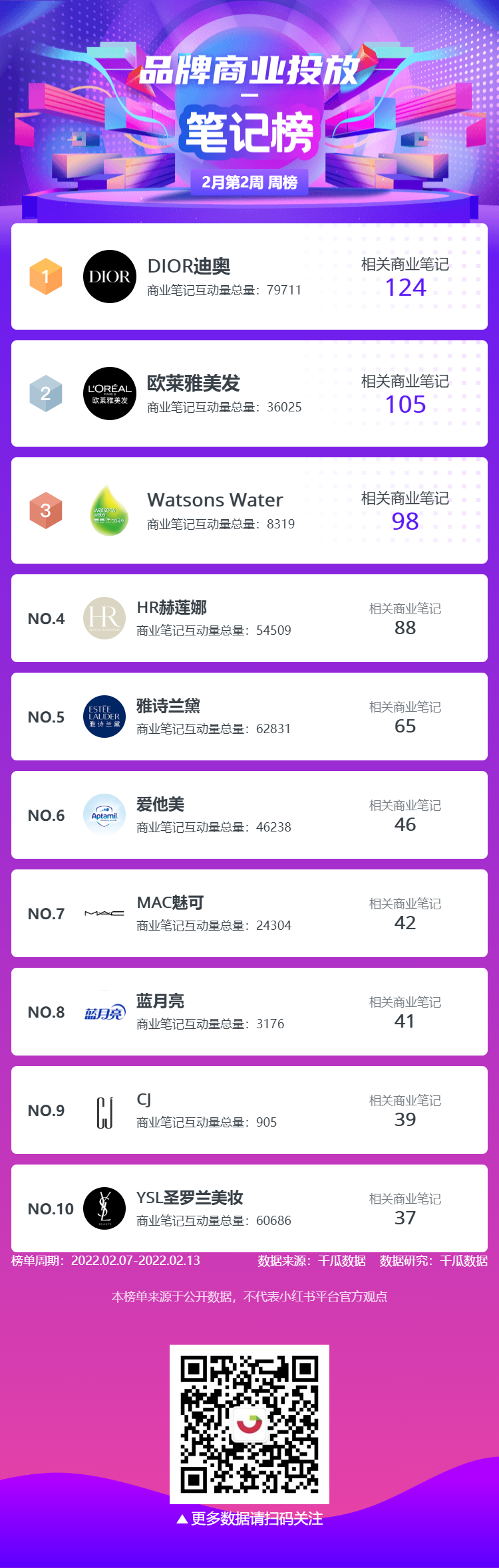 品牌商业投放榜-笔记榜中“DIOR迪奥”排名第一,相关商业笔记124篇;“欧莱雅美发”排名第二,相关商业笔记105篇;“Watsons Water”排名第三,相关商业笔记98篇。