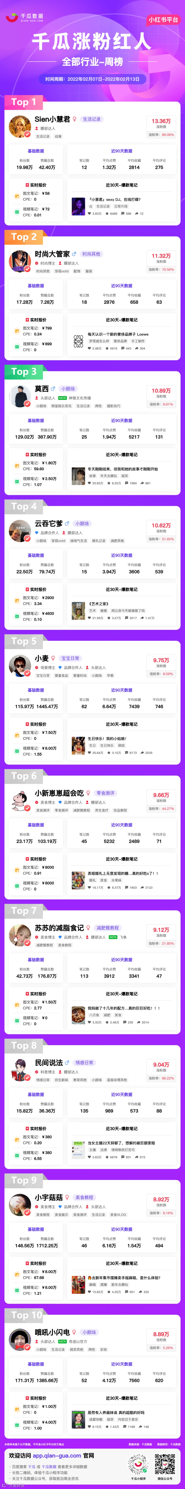 小红书涨粉红人-全部行业中“Sien小慧君”排名第一,涨粉数13.36万;“时尚大管家”排名第二,涨粉数11.32万;“莫西”排名第三,涨粉数10.89万。
