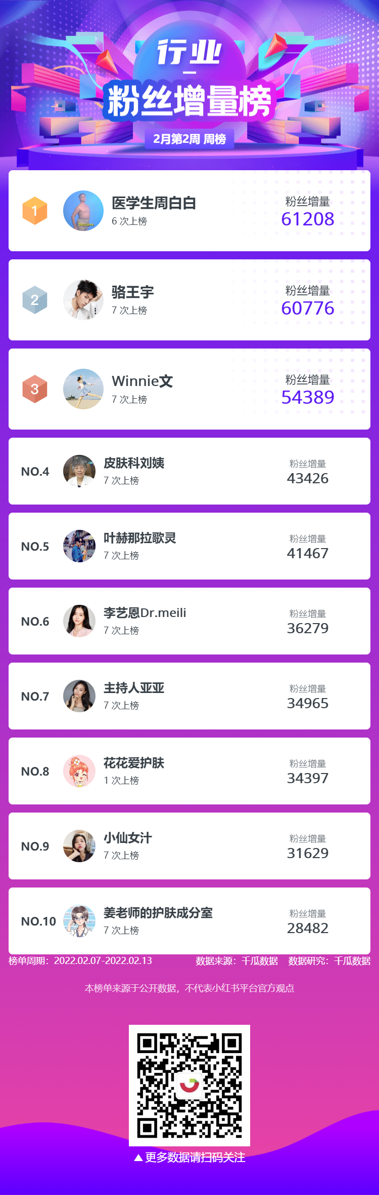 护肤行业-粉丝增量榜中“医学生周白白”排名第一,粉丝增量61208;“骆王宇”排名第二,粉丝增量60776;“Winnie文”排名第三,粉丝增量54389。