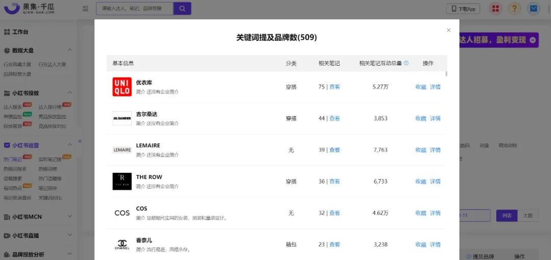 筛选近90天内、服饰穿搭笔记类型下可见,关键词提及品牌数509个,其中【优衣库】相关笔记最多为75篇,相关笔记互动总量为5.27万;【COS】相关笔记32篇,相关笔记互动总量4.62万。