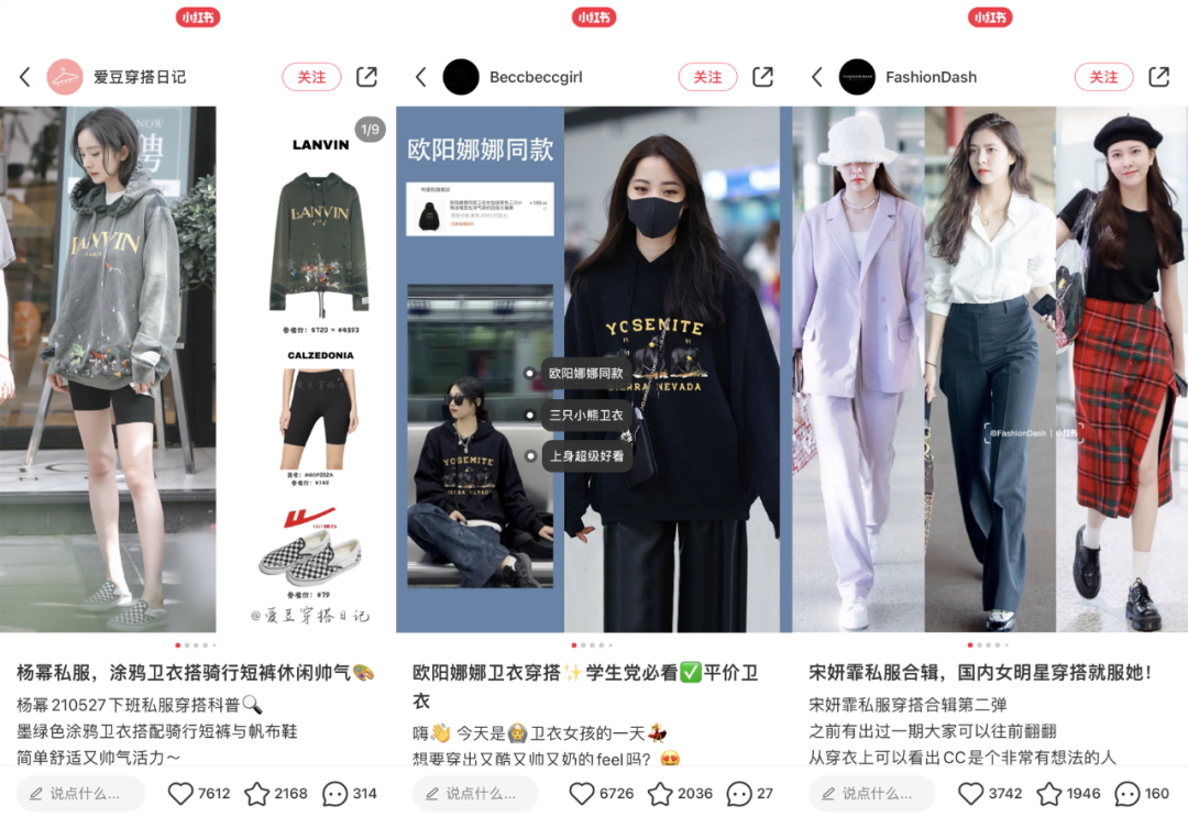 目前私服在小红书比较受欢迎的明星有杨幂、欧阳娜娜、宋妍霏等,当然,品牌和博主在蹭相关热点时需要关注明星风评,并形成一定的版权意识,避免翻车。