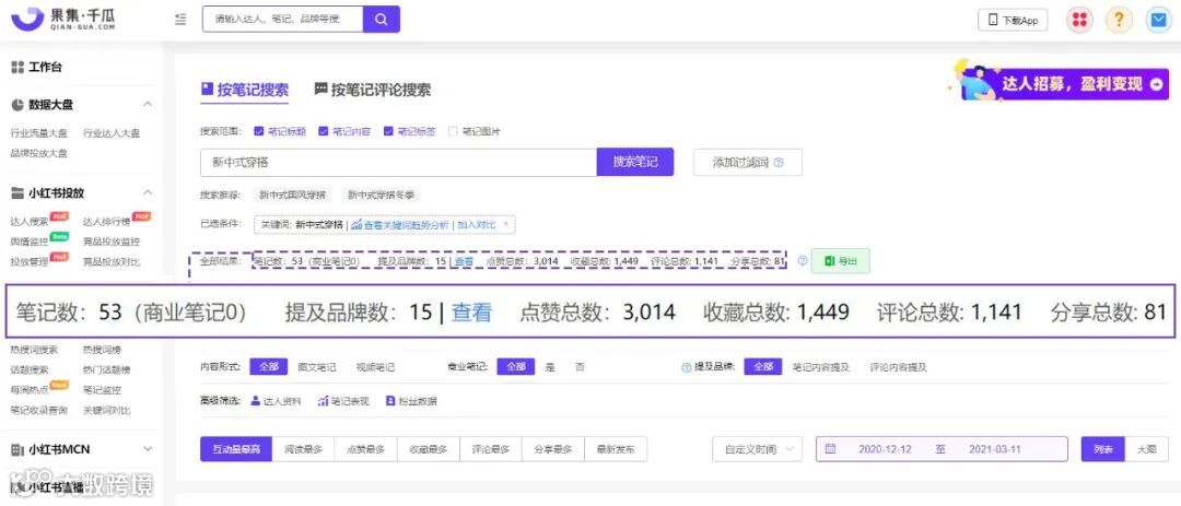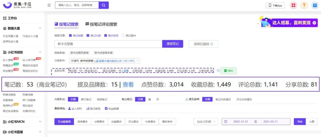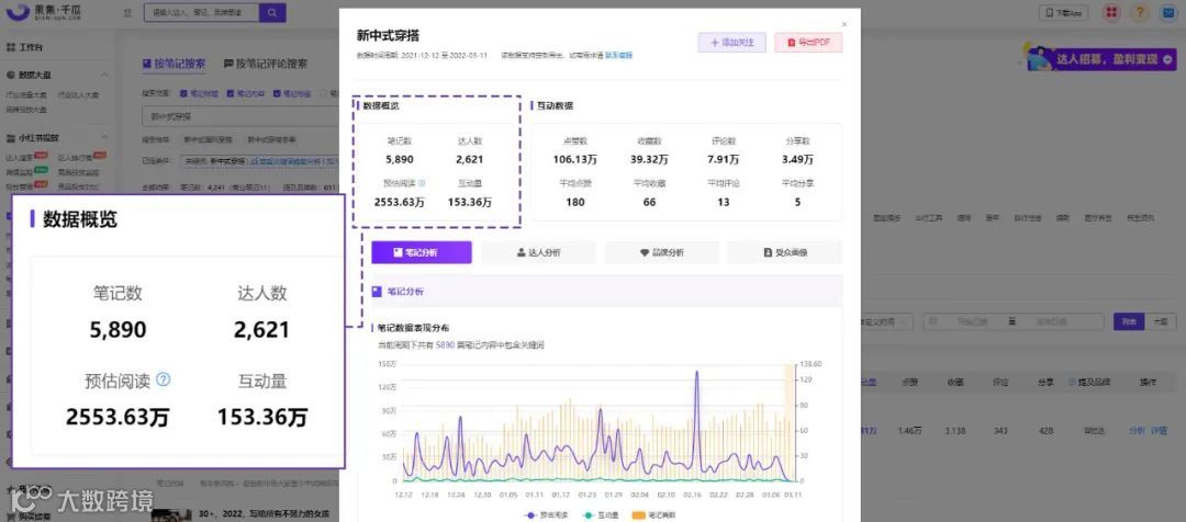 千瓜数据-关键词趋势分析显示,近90天内,小红书【新中式穿搭】相关笔记5890篇,预估阅读高达2553.63万,互动总量为153.36万。
