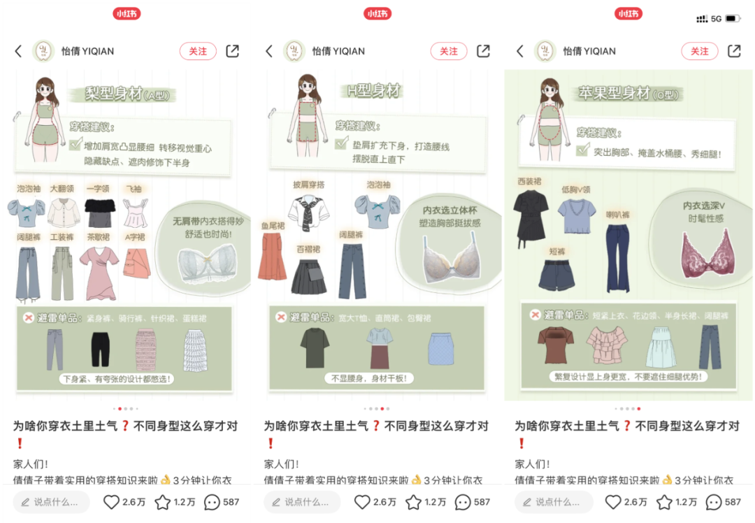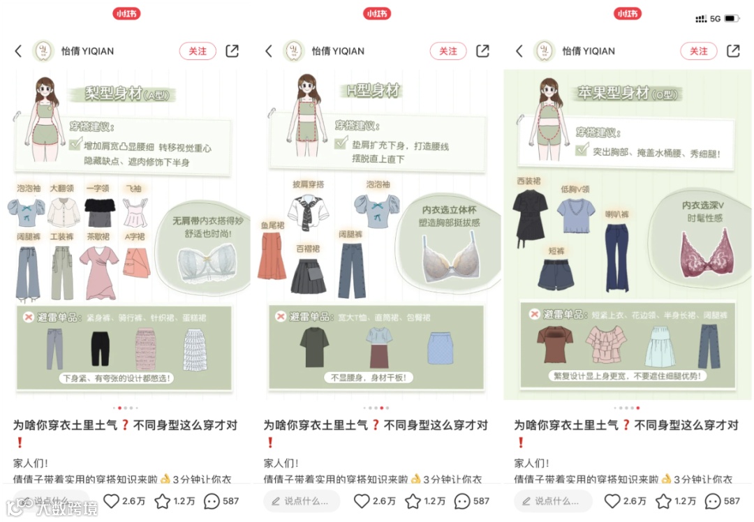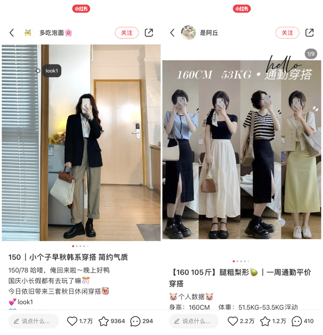 除了各式各样的种草热点和形式之外,品牌和博主还可以通过针对不同身材的穿搭技巧来进行差异化内容布局。