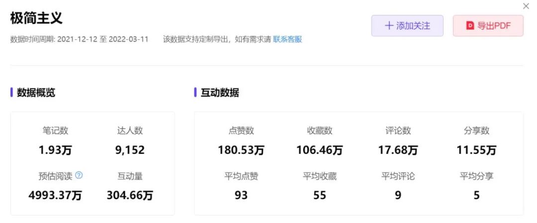 首先查看关键词趋势分析可见,【极简主义】在近90天内相关笔记数1.93万篇,预估阅读高达4993.37万,互动总量304.66万,在小红书拥有超高的人气热度。