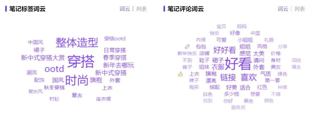 从笔记标签词云中可以发现更多相关可布局的关键热词,如“旗袍”、“国风”、“复古”等,从笔记评论词云“好看”、“喜欢”、“链接”中可看到用户对此类笔记的良好反响。