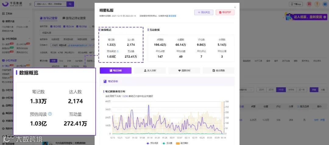 关键词趋势分析显示,近90天内【明星私服】在小红书内相关笔记1.33万篇,关联达人2174位,预估阅读达1.03亿,互动总量为272.41万,数据庞大。