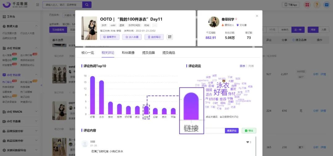 小红书腰部达人@叁草同学 通过分享自拍“我的100件泳衣”系列打造出一篇篇小红书爆文,如下图【Day11】篇笔记互动量高达8万,在评论热词Top10中,“好看”、“泳衣”、“链接”上榜,对用户实现了深度种草。