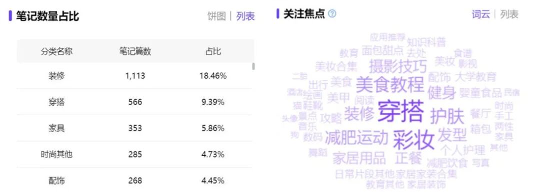 从笔记数量占比来看,虽然【装修】类相关笔记以18.46%的占比超过穿搭所占比的9.39%,但在粉丝关注焦点中,【穿搭】却是排行第一,更受用户的关注。