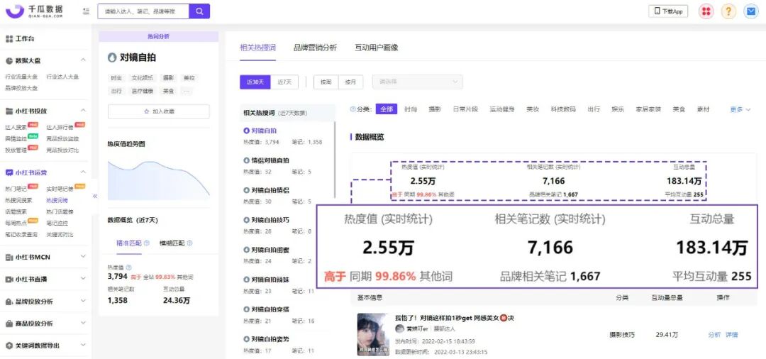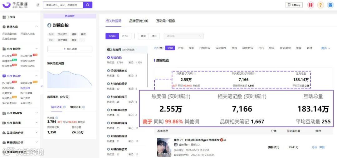 千瓜数据-热词分析显示,近30天小红书热词【对镜自拍】热度值2.55万,高于同期99.86%其它词,相关笔记数7166篇,互动总量为183.14万。