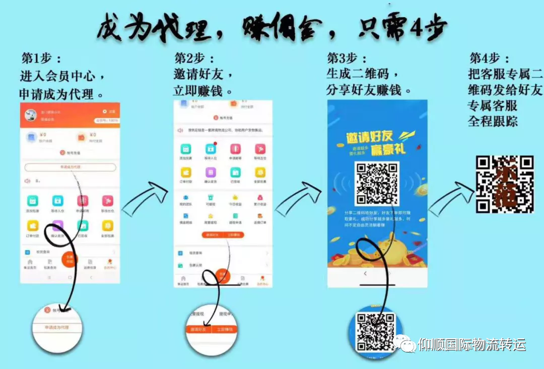 把你的客服的专属二维码分享给朋友。所有的发货事宜全部由公司专业客服负责。你团队的成员每发一次货,你就能按运费获得3%—5%的佣金。