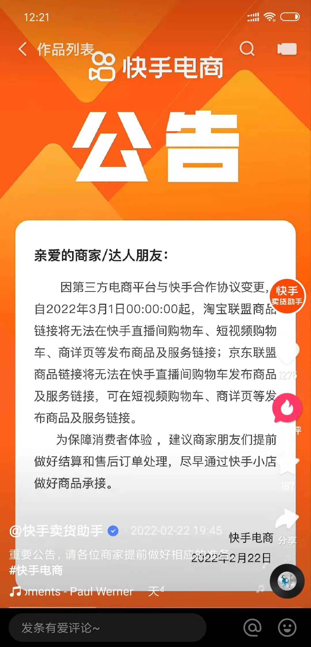 因合作协议变更,3月1日起,淘宝联盟商品链接无法在直播间、短视频、商品详情页挂链接,京东联盟商品无法在直播间挂链接。