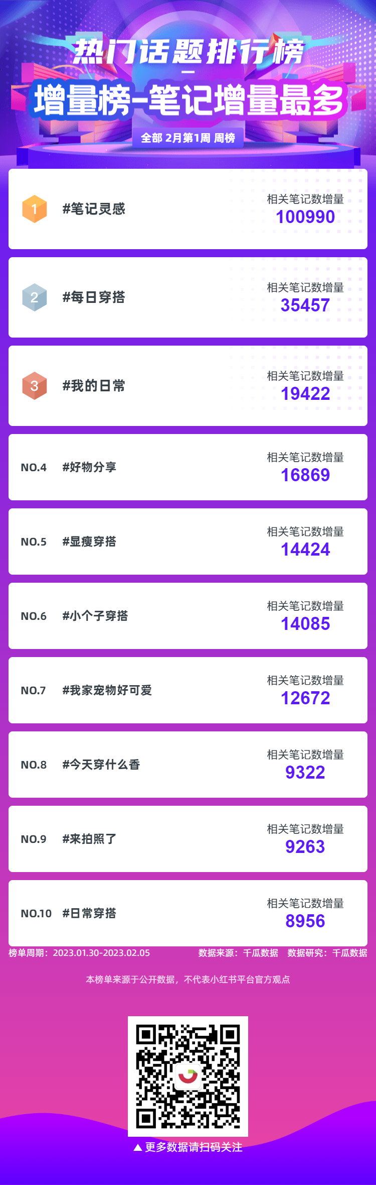 热门话题排行榜“笔记灵感”排名第一,相关笔记数增量100990篇;“每日穿搭”排名第二,相关笔记数增量35457篇;“我的日常”排名第三,相关笔记数增量19422篇。
