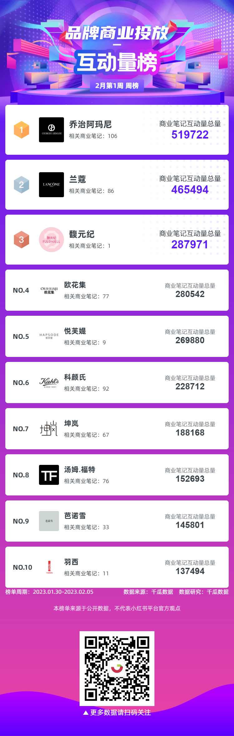 周榜 | 2月第1周千瓜品牌创作者排行榜(小红书平台) 千瓜