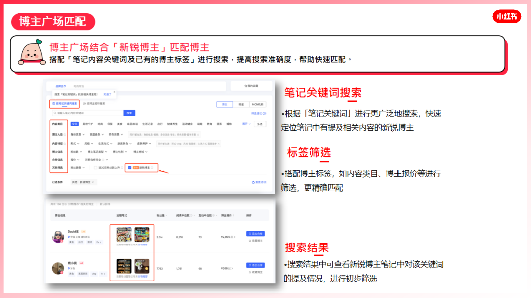 博主广场结合「新锐博主」匹配博主,搭配笔记内容关键词和已有的博主标签进行搜索,可提高搜索准确度,帮助品牌快速匹配博主。