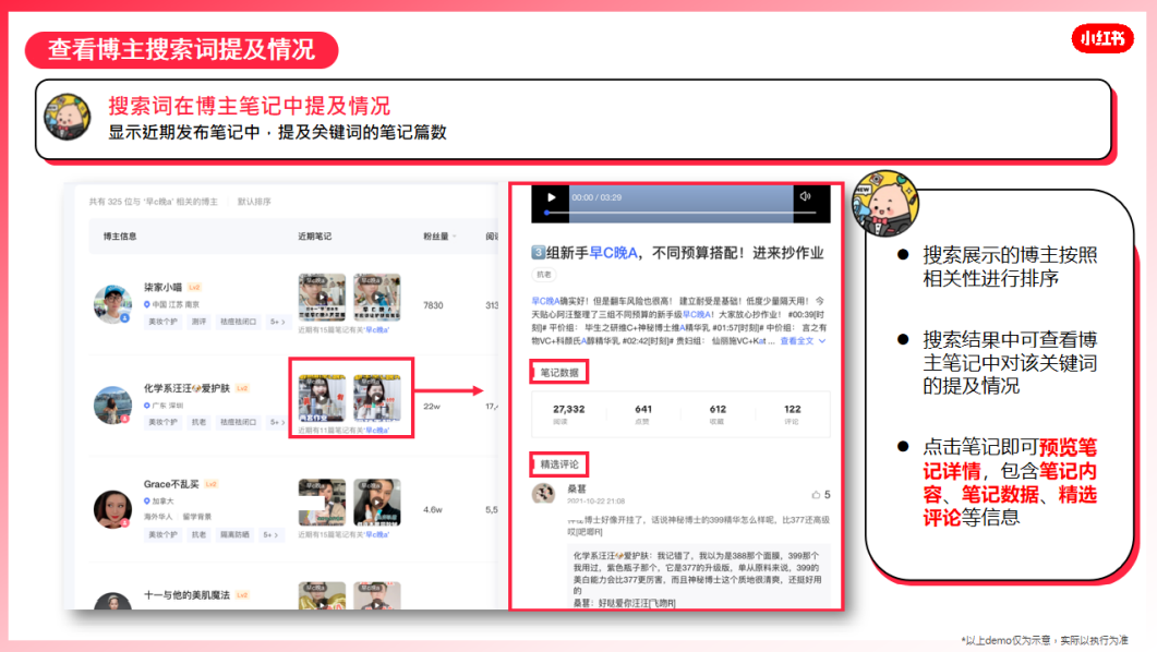 经搜索结果展示的博主将按相关性排序,品牌可在搜索结果中查看博主笔记中对该关键词的提及情况,点击笔记即可预览笔记详情,包含笔记内容、笔记数据、精选评论等信息,做二次契合度预判。