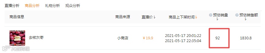 比如通过观众画像男女比例,可以看到「阿龙美食教学」直播间女性用户占比71.46%。通过预估销量,我们发现直播间最受用户欢迎的是小商店的去核灰枣,预估销量92,可以看出直播间女性用户对这款美食的喜爱,那么这款产品就可以考虑成为常驻的直播选品。