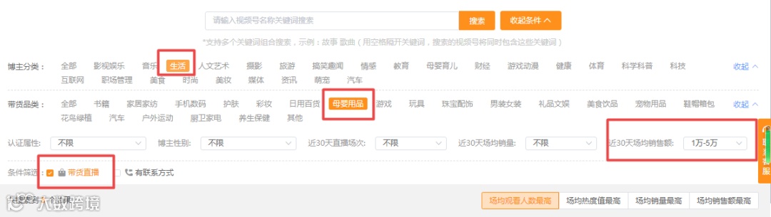 比如我想要生活类直播带货博主,带货品类为母婴育儿,近30天场均销售额区间为1万-5万,可以看到筛选结果有3个。