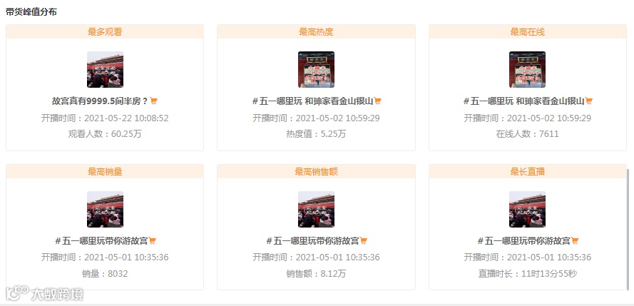 在带货峰值分布,可以看到该账号最高一场观看人数有60.25万,同时在线人数有7611人。从人数及转化数据综合来看,该账号带货能力较为良好。