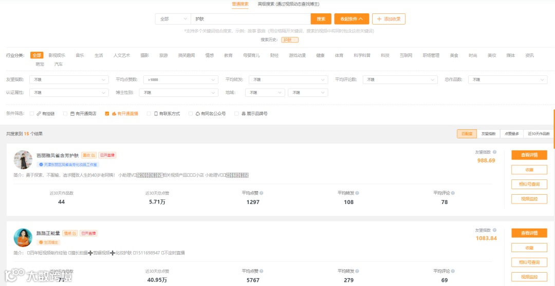 比如,我们想投放一个关于护肤品的产品广告,根据产品的特性在搜索框输入关键词:护肤,平均点赞选择大于1000。