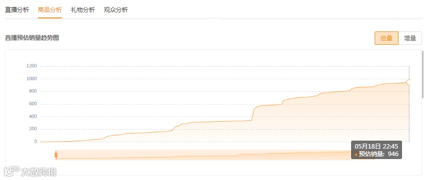 而且通过商品预估销量趋势图还可以分析直播的转化效果如何,比如我们之前监控「阿龙美食教学」的一场直播,直播时常近5个小时,预估销量946,直播转化效果不错。