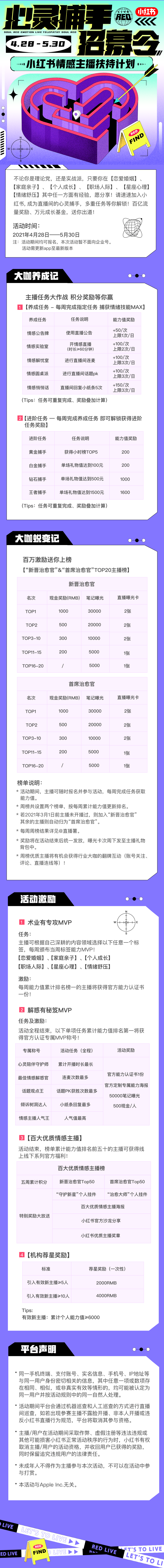 4月28日,小红书重磅发布【心灵捕手招募令】情感主播扶持计划,投入百亿流量曝光和万元成长基金邀请扶持站内、站外优质情感主播。