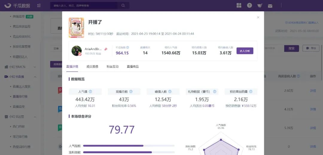 小红书达人AriaAndBrandon则是其先驱者之一,以分享恋爱与生活的日常赢得了众多粉丝关注之外,还多次上榜小红书带货直播榜与直播达人榜,在4月小红书带货直播榜观看数最高中排行第二,直播观看总数43万,预估商品销量2.16万、预估销售额559.12万。