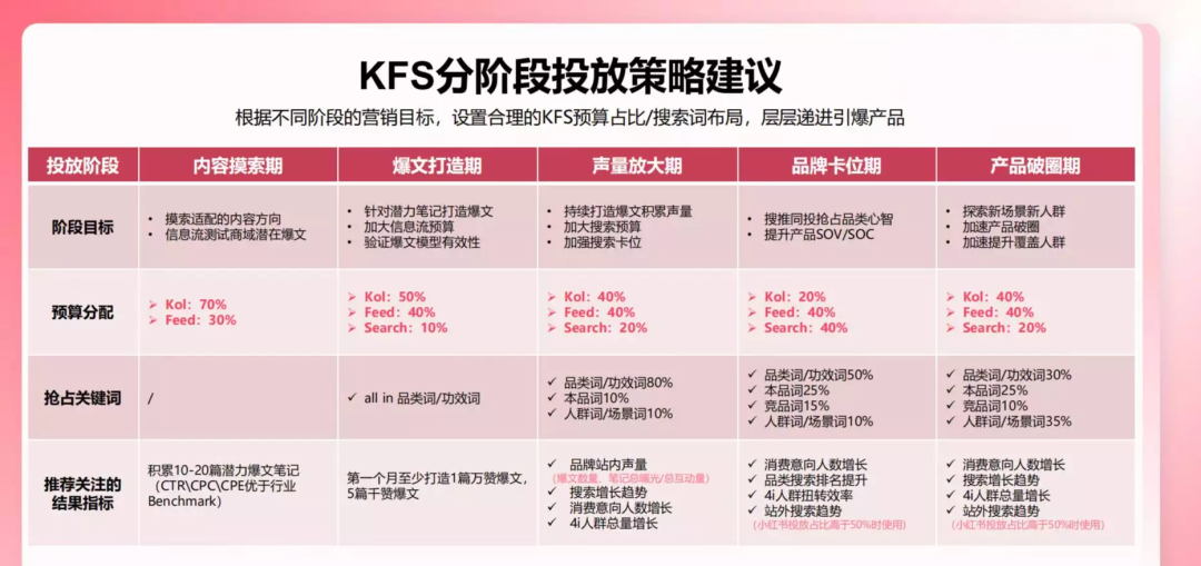 4、信息流与搜索广告是助推品牌爆文、提升留存转化的投放手段,参考小红书KFS内容营销组合策略,能更精准地触达用户、影响决策、层层递进引爆产品。