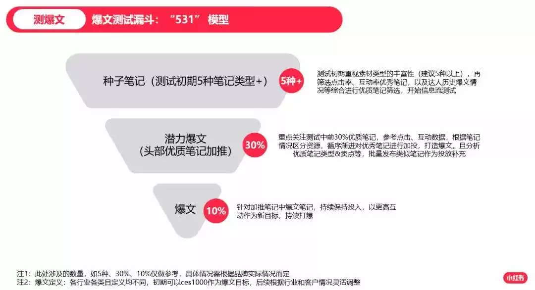 品牌在从未投过信息流的情况下,建议利用“531投流模型”进行投放测试,例如该阶段有10篇报备笔记,将其全部投放,首先预算可以低一点,一篇笔记投入200-500的价格,根据其核心点击率再去选择CTR高、CPE低的5-7篇笔记加量投放,此时重点关注CPE数据,从互动中观察用户是否对品牌产品产生兴趣,能否达到留存转化,再去对CPE数据较好的笔记进行持续放量。