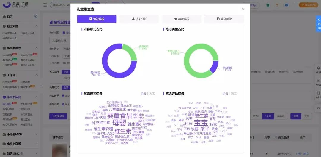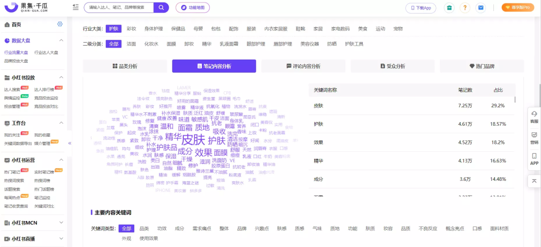 3、通过果集·千瓜数据-行业流量大盘中的笔记内容分析、评论内容分析等数据围绕用户关注焦点进行内容发散,挖掘出可复制的爆款内容和消费场景。