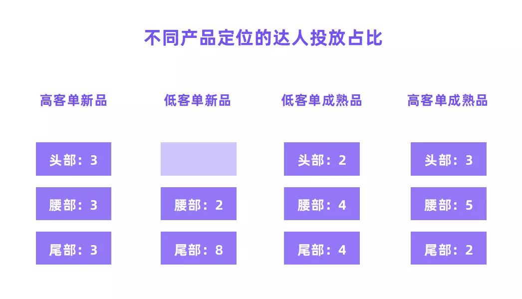 低客单成熟品,属于已经从新品过渡后的阶段,则建议重腰尾部投放,以头腰尾部2:4:4的比例筛选达人;而高客单成熟品,通常建议重头腰,以3:5:2的比例进行投放,这个阶段更需要的是能给用户带来强消费决策的博主。