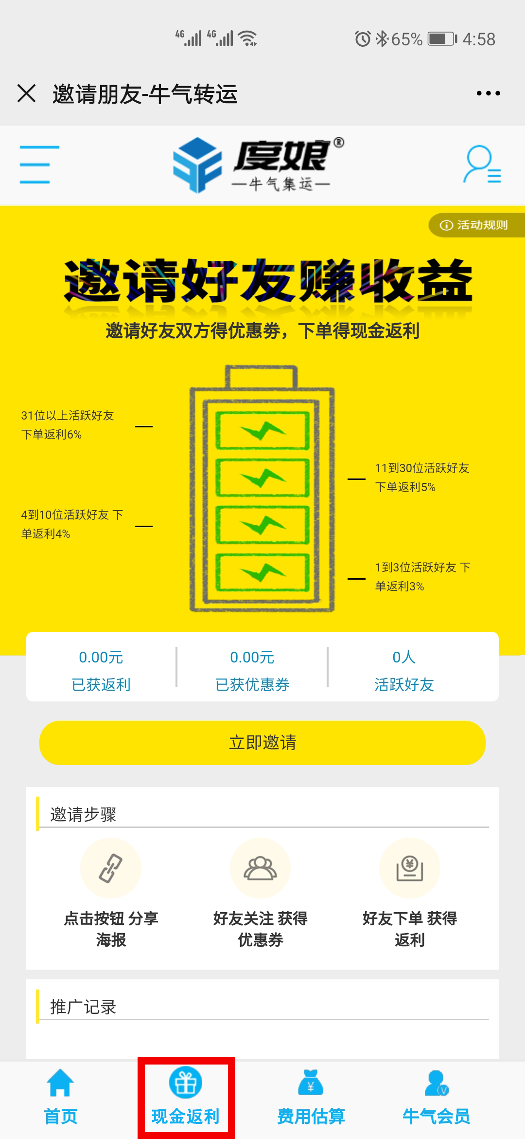 现金返利(部分手机显示为推广)在最下方菜单上就能看到,如果你拥有华人、留学生资源,或者身边有需要寄国际快递的朋友,都可以使用现金返利功能让他成为你的活跃好友!