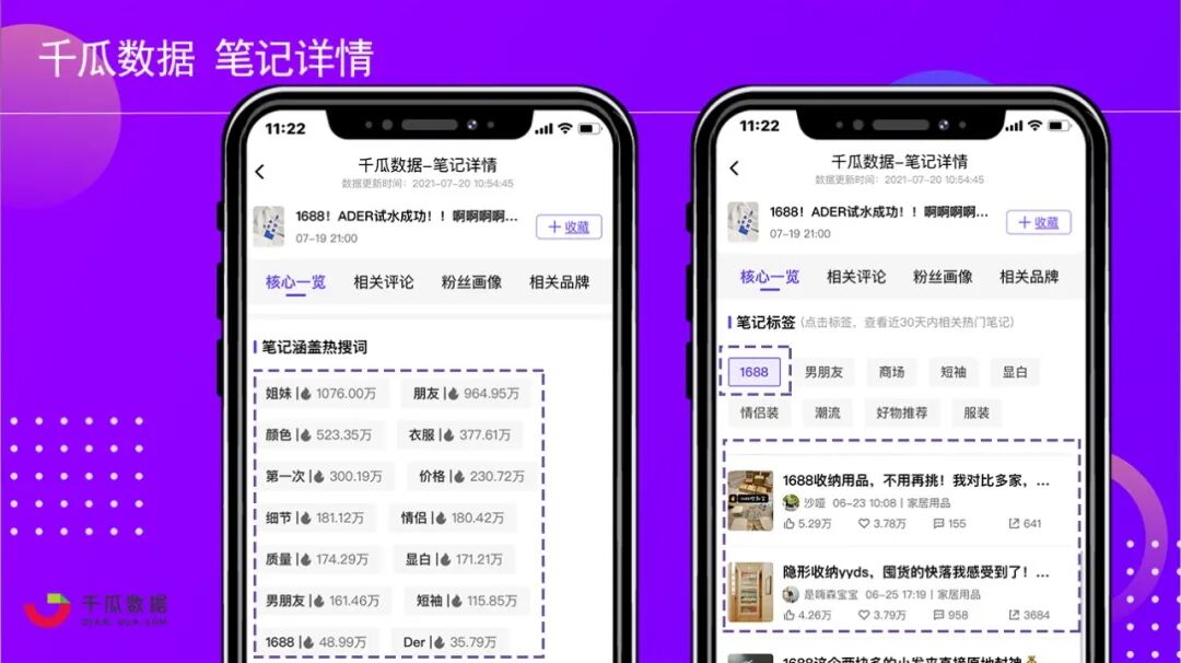 例如这篇笔记《1688!ADER试水成功!啊啊啊啊便宜好穿!》,可通过核心一览、相关评论、粉丝画像多角度分析笔记。通过笔记涵盖热搜词分析笔记涵盖了多个热度较高的词,可参考布局笔记的热搜词,帮助笔记获取更多热度和流量。